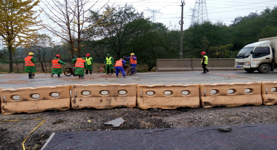 刚开始,过往车辆有序依次通过,大概半个小时后,一部渣土车坏在了桥头处,阻挡了后面车辆的通行,再加上天色已晚,很多车辆着急回家,现场交通一度陷入混乱。项目技术负责人在现场召开了紧急临时会议,决定打开左幅水稳段单向放行,经过指挥,通行情况恢复正常,抢修工作得以继续。在经过近5个小时的连续奋战后,终于将坑洼处全部回填完毕,车辆恢复正常通行后,大家才撤离现场。