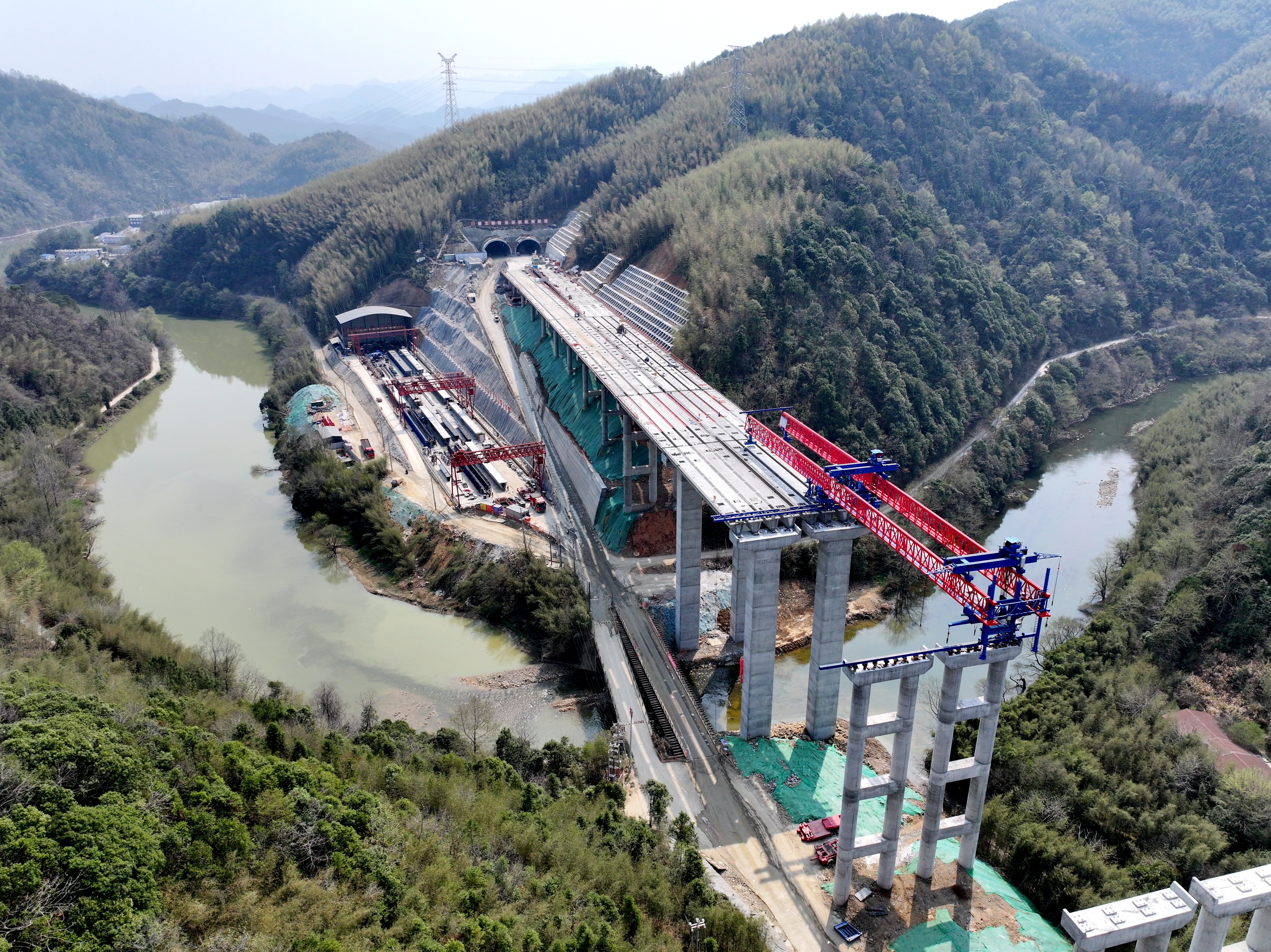 在桥梁施工方面,横跨浣溪河的特大桥建设同样面临挑战。为克服12%运梁坡度带来的困难,项目创新采用“双主机双制动运梁炮车”技术,经过多次模拟推演,成功实现首片40米箱梁精准架设。这一突破,标志着项目施工从下部结构向上部结构转换,实现桥梁与隧道工序无缝衔接,为后续架梁作业奠定基础。截至目前,项目路基填筑已完成98%,桥梁桩基工程全部完工,梁板预制架设进度突破55%。