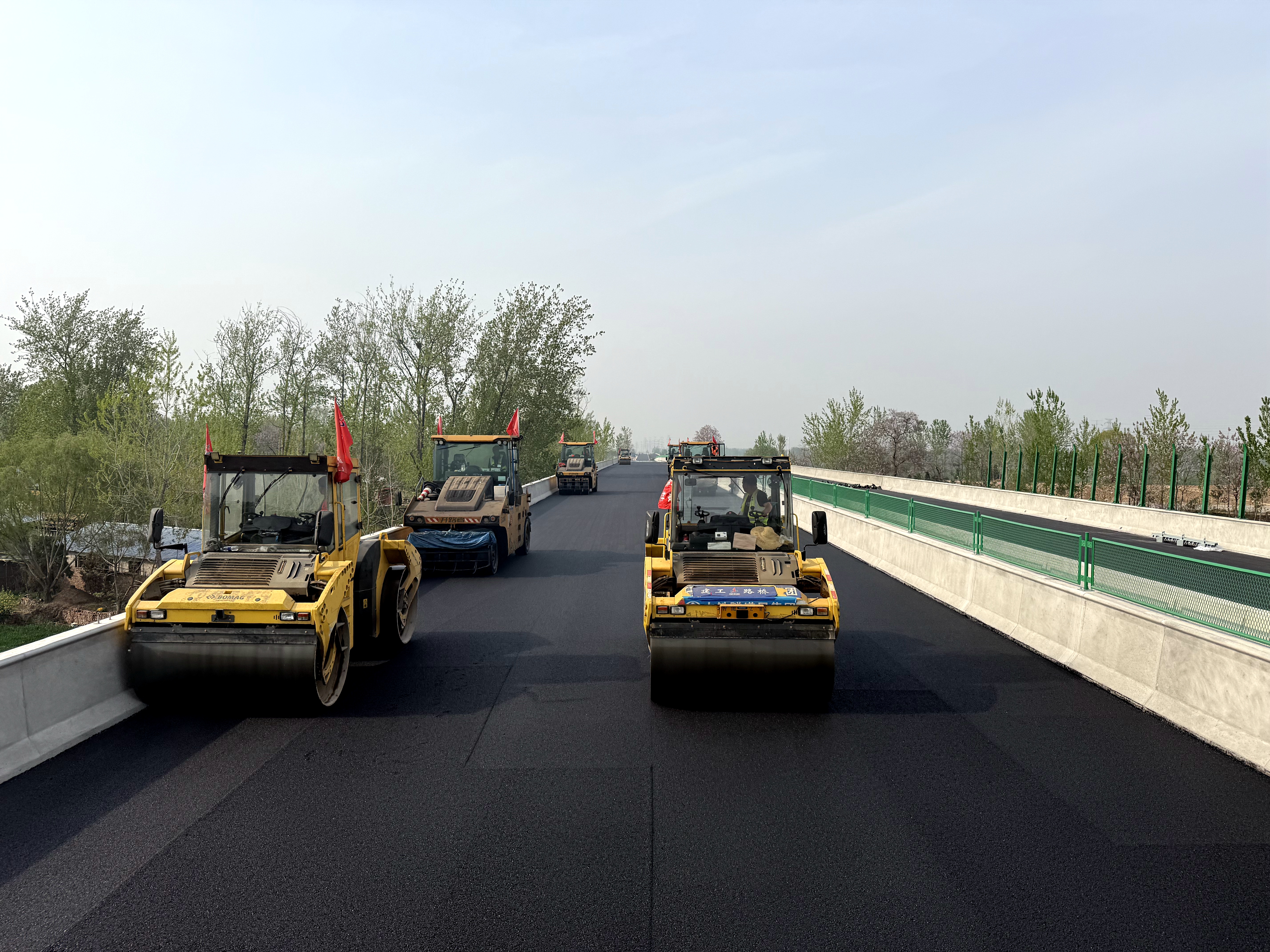 在徐淮阜高速淮北段沥青施工现场,路面专业化服务中心60天完成25万吨沥青混合料摊铺工作,为保证工程质量,采用“煤制气 余热利用 电磁加热”加热综合应用技术保证沥青混合料连续稳定生产,应用机制砂生产线保证关键材料质量稳定。三班人员、两套设备轮流作业,力争在4月20日前完成主线贯通,4月25日沥青面层全线竣工。