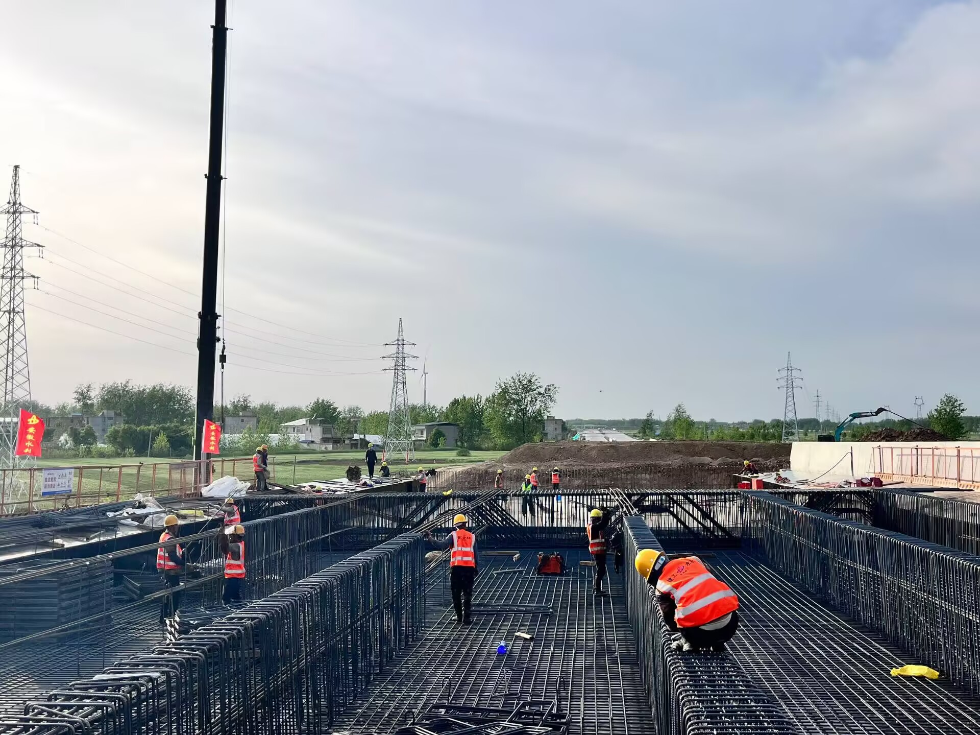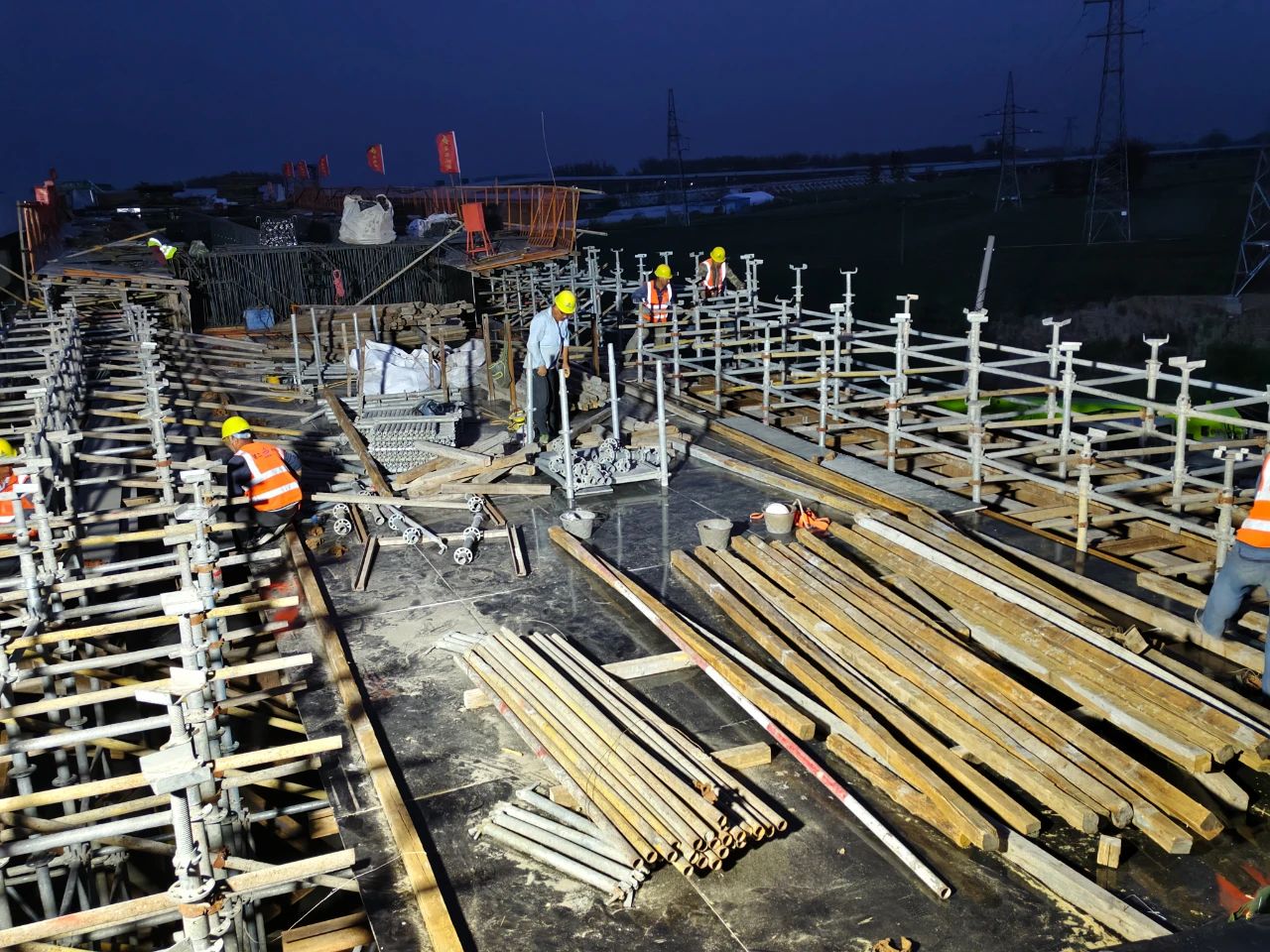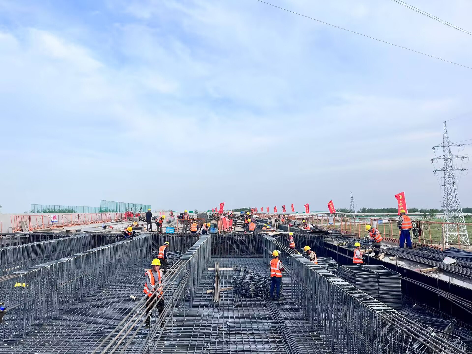 前期由迁改工原因,颍临高速路基05标公桥枢纽内d匝道桥和阜(阳)淮(滨)分离立交桥的一联二跨连续箱梁现浇、一联四跨连续箱梁现浇、一跨25米预制箱梁安装(均包括桩基和下部结构)未能开工。在经过项目多次积极主动联系业主单位及迁改单位,积极配合迁改施工情况下,2025年3月1日影响项目全线贯通的35kv高压杆线顺利拆除完成。项目随后立即组织编排施工计划,倒排工期,合理配置人材机,迅速启动桩基施工,过程中加强管理及时调整施工计划,增加人员设备投入,经过近一个半月的日夜奋斗,目前桩基下部及梁板安装已完成,现场施工体系已迅速完成转换,进入桥面系及现浇箱梁施工阶段,经过与地方交通局及各级主管单位的沟通协调,项目及时解决d匝道桥现浇段跨318省道门洞搭设及省道两侧限高通行交通管制问题,确保施工任务能按时完成。