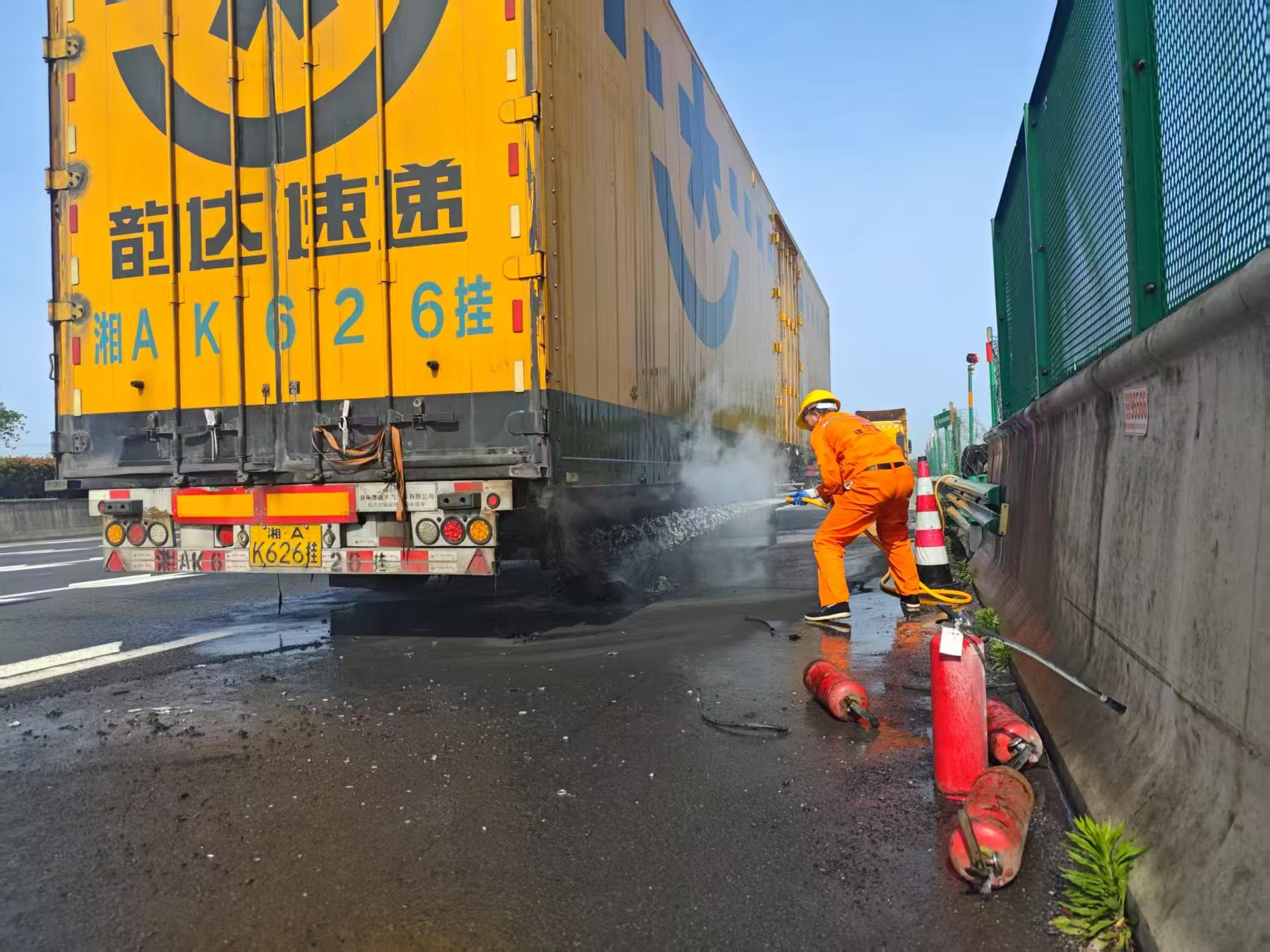 当天,施工现场的工作人员发现不远处一辆物流车浓烟滚滚,火苗正从车厢处不断窜出。项目负责人接报后,迅速组织现场施工人员携带灭火设备赶赴现场。同时,安排专人在后方设置警示标志,疏导交通,防止二次事故发生。