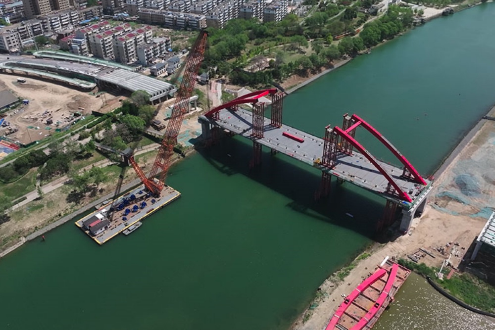 目前,该项目已完成钢箱梁主体、桥面板、拱肋合龙等主体工作。“五一”假期里,项目启动吊杆张拉作业,同步推进水平系杆张拉与涂装收尾,实现多专业立体施工,向着完成全桥主体施工节点发起最后冲刺。