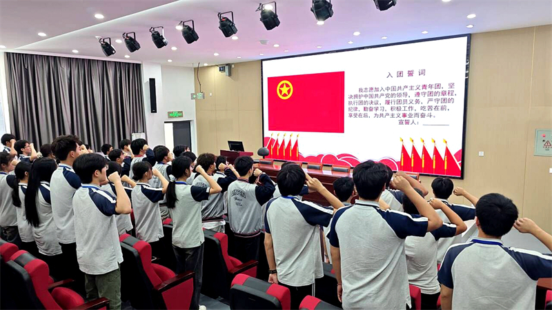仪式在庄严的国歌声中拉开帷幕。全体师生肃立,齐唱国歌,表达了对祖国的热爱与崇敬之情。随后,陈淼老师宣读了新团员名单,新团员上台领取团员证和团徽,全体新团员在团委委员程蓉的带领下,面向团旗庄严宣誓,铿锵誓言响彻礼堂,彰显着新时代青年的蓬勃朝气。新团员代表在发言中表达了对团组织的向往和加入共青团的自豪之情,表示将以更高的标准要求自己,努力学习科学文化知识,积极参与团组织的各项活动,为共青团事业贡献自己的力量。