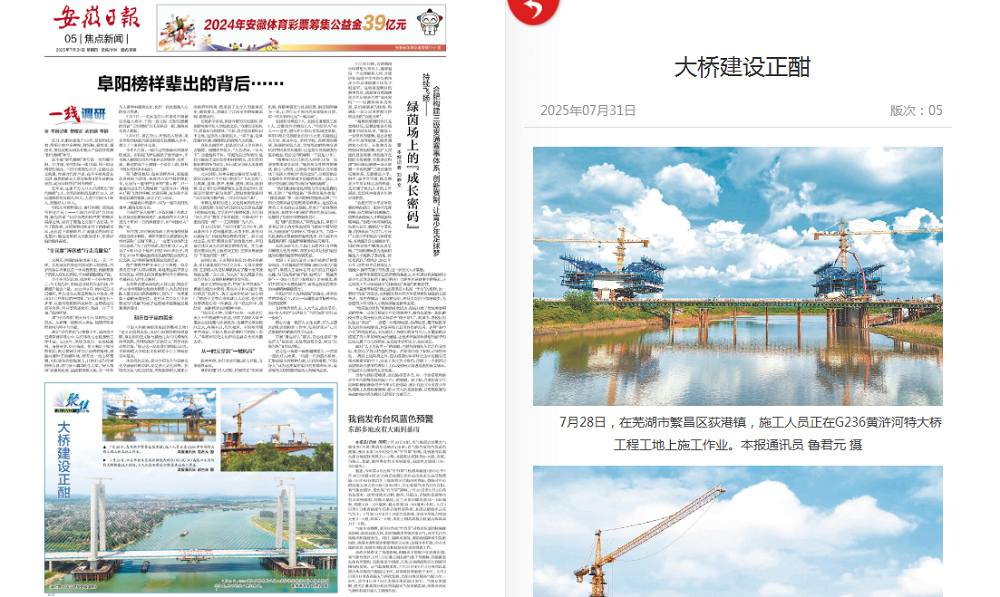 近日,《安徽日报》以图片新闻形式报道了建工建投繁昌区g236项目二标段黄浒河特大桥建设进展。