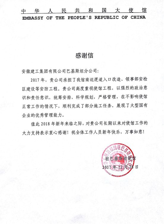 on the occasion of the coming new year’s day, 2018, embassy of the people’s republic of china in pakistan sent a letter of thanks to aceg pakistan branch highly commending the state-of-the-art technologies, the qualities and managements of the modification and construction works for the embassy’s facilities and premises completed by aceg pakistani branch and also expressing its new year’s blessings to all staff of aceg pakistani branch.