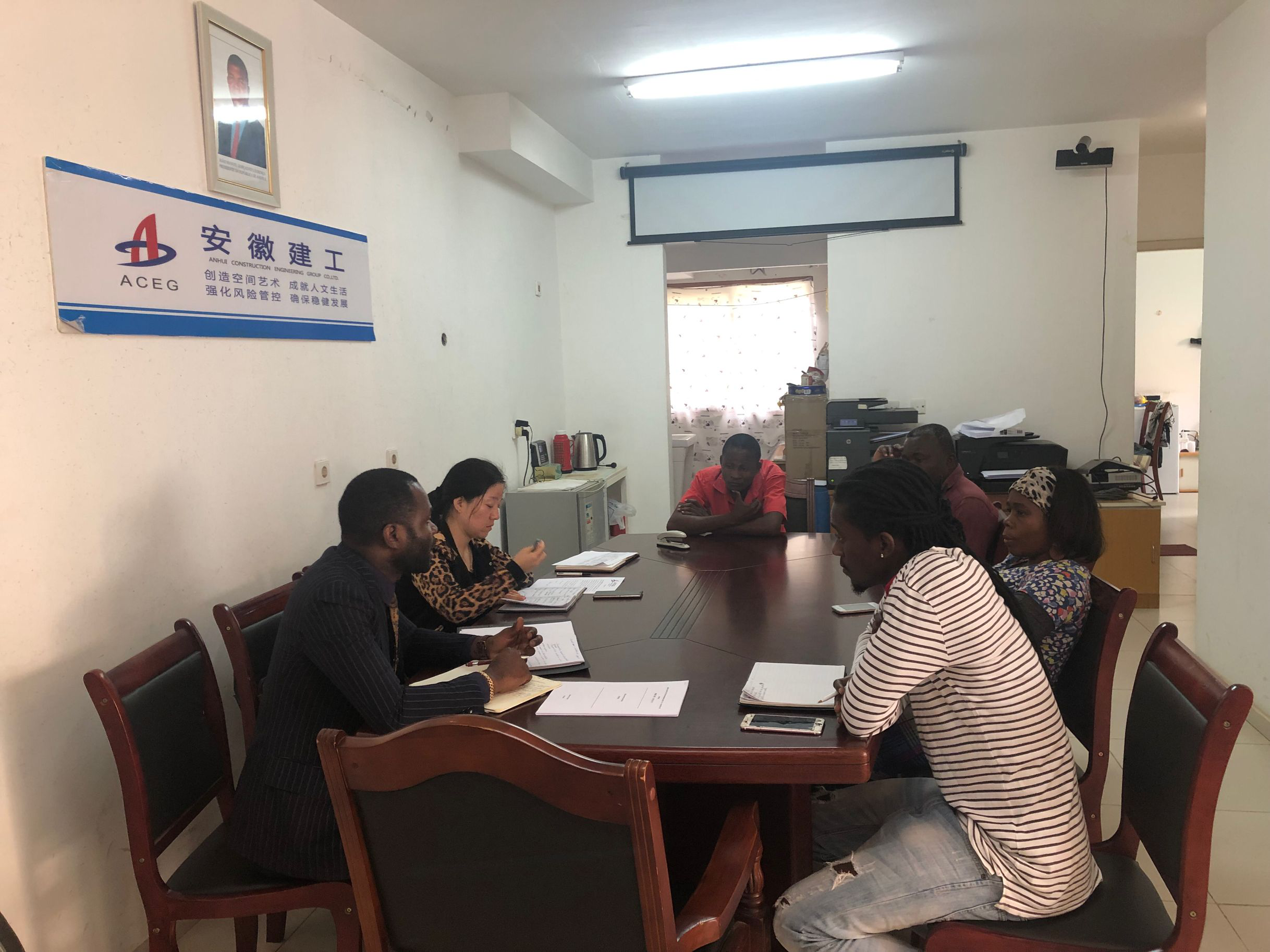 in order to develop a better local staff management system standardizing the management of local angolan staff, aceg angolan branch held an opinion gathering meeting attended by all the local employees with the branch`s headquarters on the morning of august 8 local time, the meeting was presided over by yanyan ma, director of the office of the branch, and mr. logan, the corporate lawyer also attended the meeting.