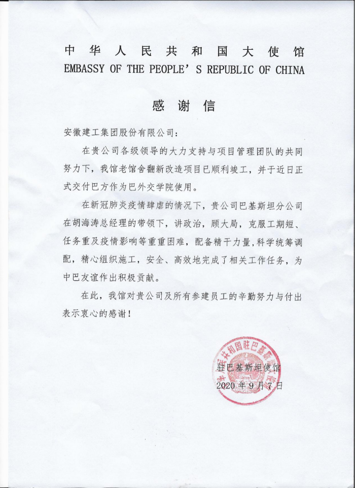 aceg pak branch, islamabad, september 8, 2020 / aceg pakistan branch received a letter of thanks from chinese embassy in pakistan, expressing its appreciations for the on-time completion of the construction project of pakistan university of foreign affairs, amid the hard times of the covid-19 epidemic.