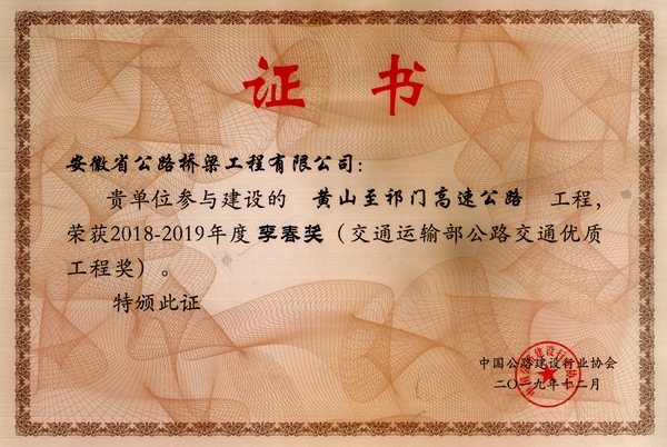 the national road quality development cloud forum organized by china road construction industry association officially concluded a few days ago, during which, the annual li chun awards 2018/2019 were awarded in the form of online network. the project expressway huangshan to qimen completed by anhui road and bridge co., ltd. - one of aceg`s subsidiaries, professionalized contractor for road and bridge construction and engineering, was honored with a“li chun” award.