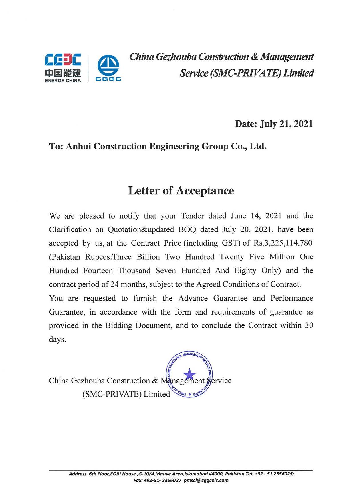 on july 22nd, aceg has confirmed the receipt of the letter of acceptance from china gezhouba construction & management service (smc-private) limited,that aceg has successfully won the bid of the project - pakistani regional dispatching center of china gezhouba group overseas investment co., ltd.